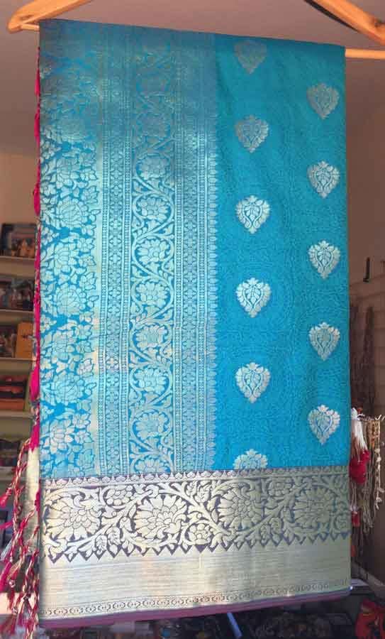 Krishna sari de seda en color turquesa precioso y estampado ligeramente en oro plateado.