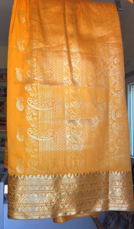 Gauranga sari de seda preciosa de color armarillo y dorado de Srimati Radharani.