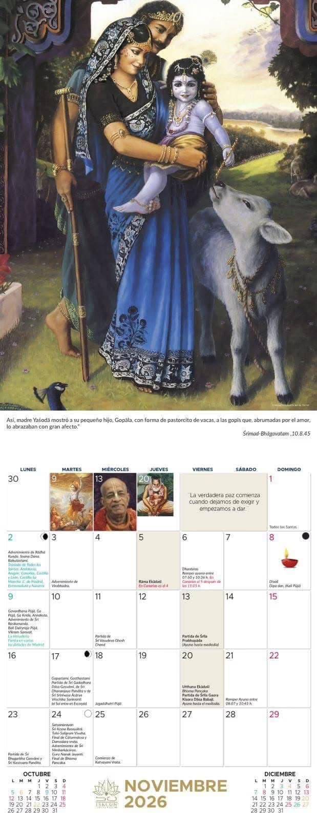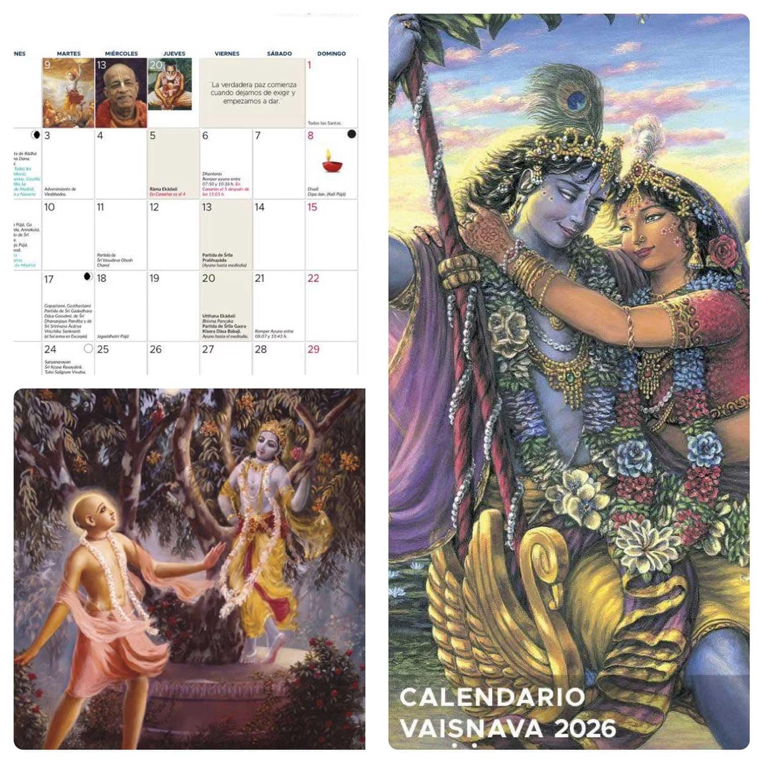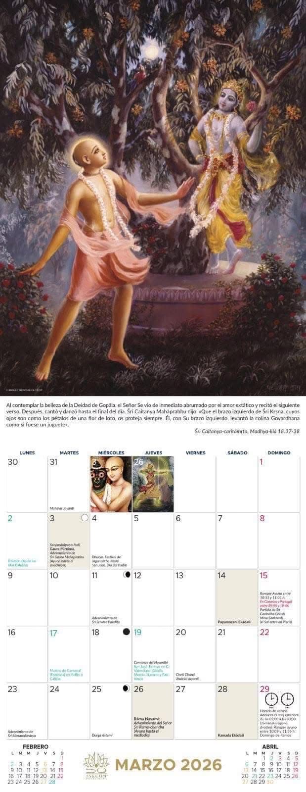 Un regalo muy atractivo para estas fechas de Navidades. Tiene una imagen nueva para cada mes-en total doce imágenes muy atractivos en color de alta definición. Hay cuadritos para marcar sus citas importantes con fechas de fiestas nacionales y festivales más importantes de calendario vaisnavas y los días de ayunos como ekadashi dos veces al mes.